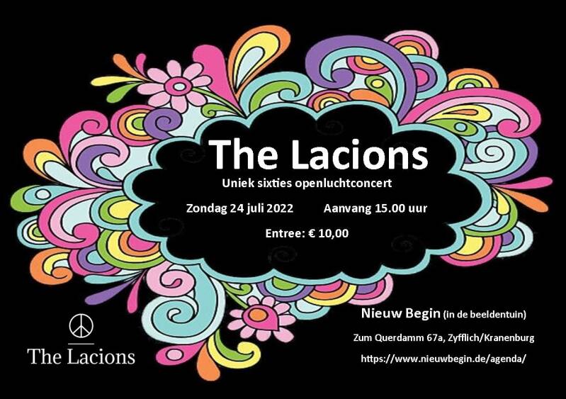 Project ‘Nieuw Begin’ heeft de eer om zondag 28 Juli op haar ‘The Lacions’ op haar podium te presenteren. De oudste, nog (weer) spelende beatgroep in Maas en Waal en verre omstreken stamt uit Beneden- Leeuwen. Ze zijn begonnen in 1964 en speelden tot eind jaren 60. Vandaag de dag zijn drie van de oorspronkelijke vier leden nog steeds actief. Hoe dat ging? Dat doen de heren tijdens hun optreden uit de doeken.